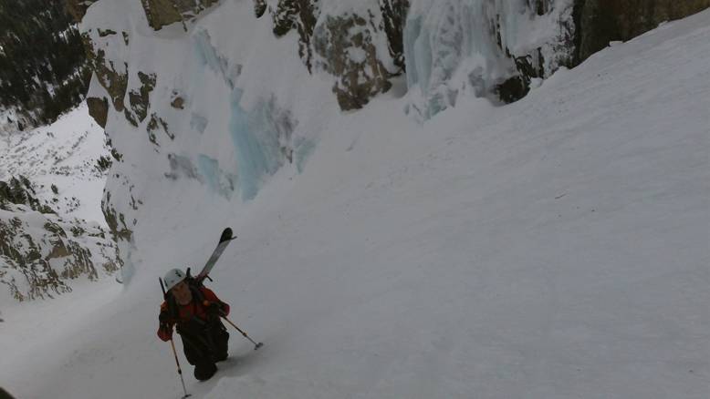 At approximately 1:15 p.m. we were kicking out a ledge large enough to take a break and put on our skis for the exciting descent. The air was crisp and cold in the shade of Prospector Peak above as we discussed our ski route and how we would navigate the narrow crux. We decided that we would have to remove our skis, stow them on our packs and downclimb the precarious ice choke. With the decision made and nothing left to do but begin our ski descent we set off down the couloir. The snow was well condensed and stable which eased our minds of the potential for avalanches but also made for fast, exhilarating turns. Jeremy stopped a couple hundred feet above the crux of the route to stow his skis before the couloir rolled over to steeper terrain. I decided to leave my skis on and gingerly make my way to just above the narrows. This proved to be much faster and surprisingly comfortable as I had no problem keeping an edge on the softening snow. A quick downclimb of 40 feet or so lead me below an ice bulge where I could kick out an area to once again put on my skis and continue the descent. Jeremy was soon reattaching his skis as well and I handed him the camera to video my turns down the steep, narrow couloir. It was by far the most aesthetic line I have ever skied, the beautiful blue ice on my right playing contrast to the monochrome granite walls on my left. Half way down the couloir I stopped at a small alcove where I yelled up to Jeremy to start his descent. Even on Teli-skis Jeremy made great turns down the tight chute and stopped next to me for a minute to share his jubilation at skiing the beautiful line. The walls of the couloir then widened and eventually gave way to the cone below Prospector Falls and the Apocalypse. The snow was warm and soft and we were soon across the creek. We then paused to gaze up at our accomplishment, a tiny sliver of snow tucked in the mass of rock of Prospector Peak.