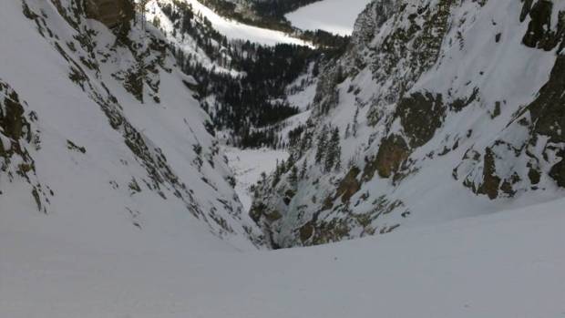 Yesterday, January, 30th, Jeremy Lupp and I skied the coveted Apocalypse Couloir off of Prospector Peak in Death Canyon. Jeremy suggested this route to me last Friday after he had got a glimpse of it while ice climbing on Prospector Falls the day before. The Apocalypse Couloir is truly a Teton Classic and one of the steepest and most hazardous ski lines in the range. We started out from Jackson a little after 7:00 a.m. and were skinning from the Death Canyon trail by 8:10. It was a relatively warm morning and we made quick work of the well laid skin track past the Phelps Lake overlook and into the canyon. My first glimpse of the couloir was a memorable one, it looked steep…very steep. While I have spent much of the past two winters ice climbing in Death Canyon I had not known of this ski line until recently. Shortly after 10 a.m. we were making our way up the cone beneath the Apocalypse.