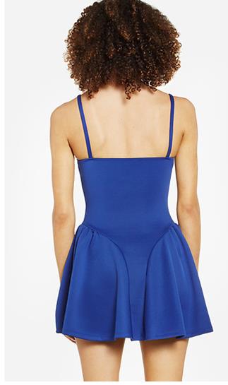 The garment pictured, combines the lovely neoprene trend with what appears to be an un-snapped body suit (you know the ones, girls) sewn into the silhouette of a skater dress. Annd, what girl wants a butt-stripe? NOT ME.