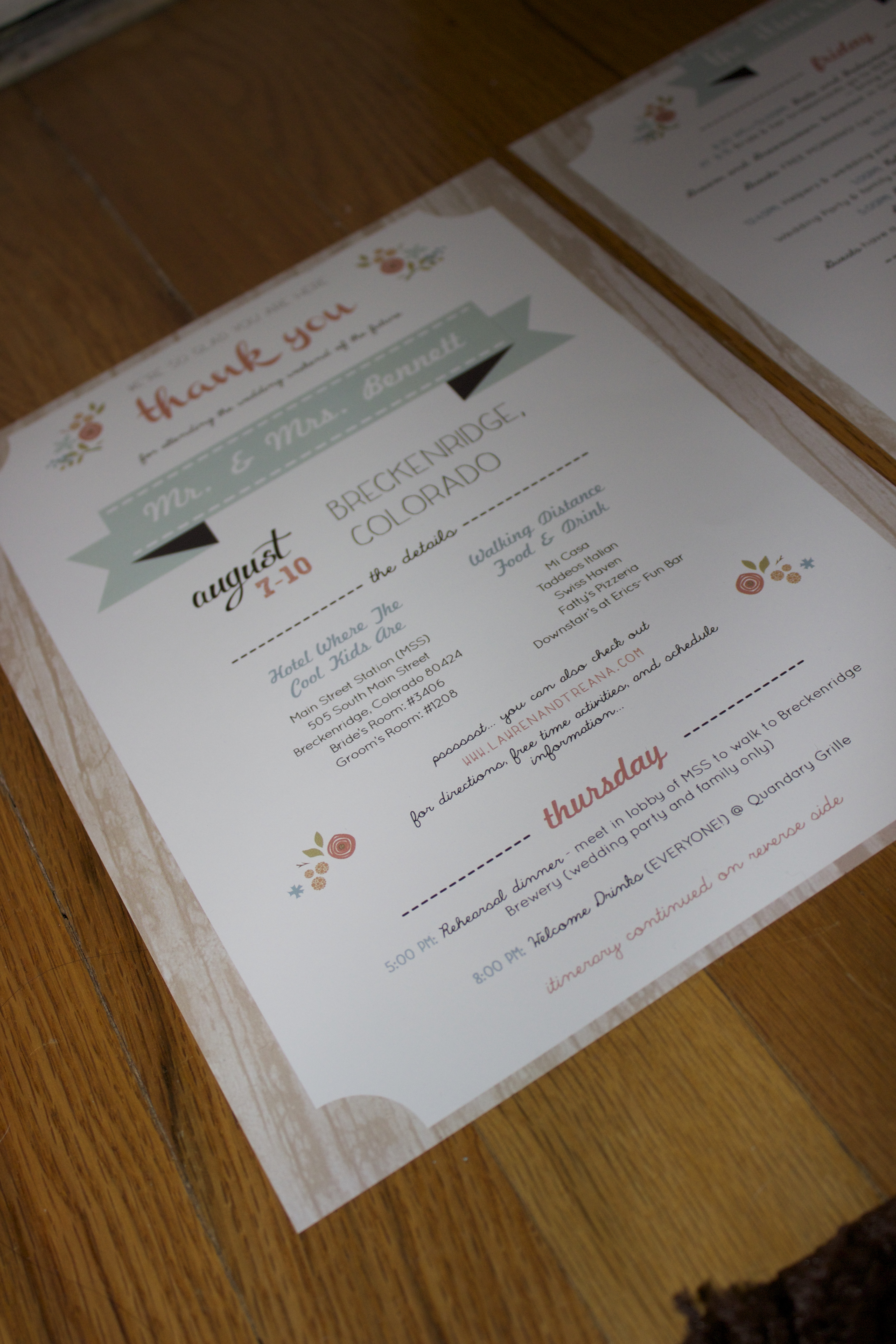 I posted about the weekend wedding itineraries and calling cards that I got from Chloe & Milo Designs on Etsy. I got them printed online at Zazzle, and JUST LOOK at how great the itineraries turned out.