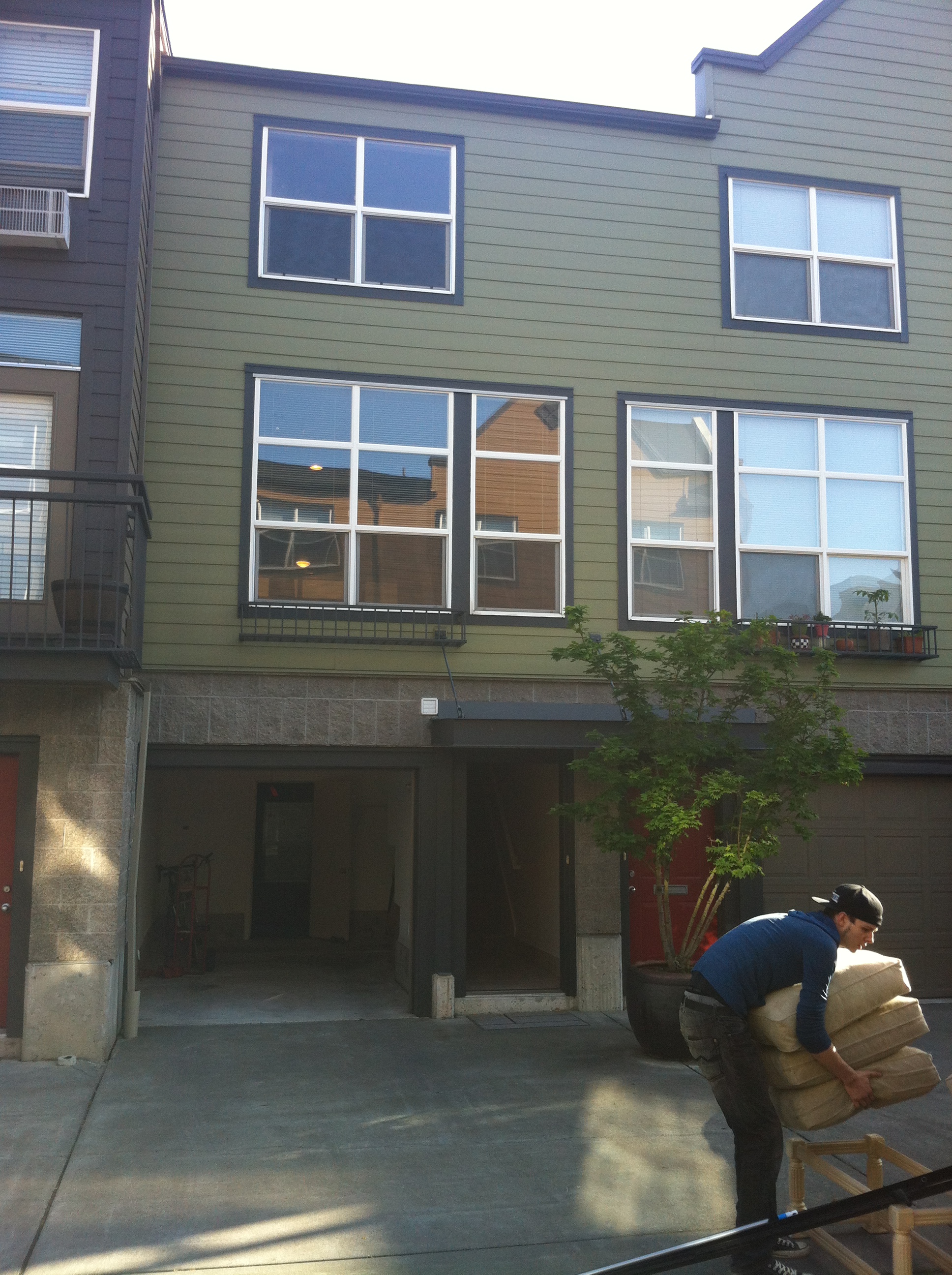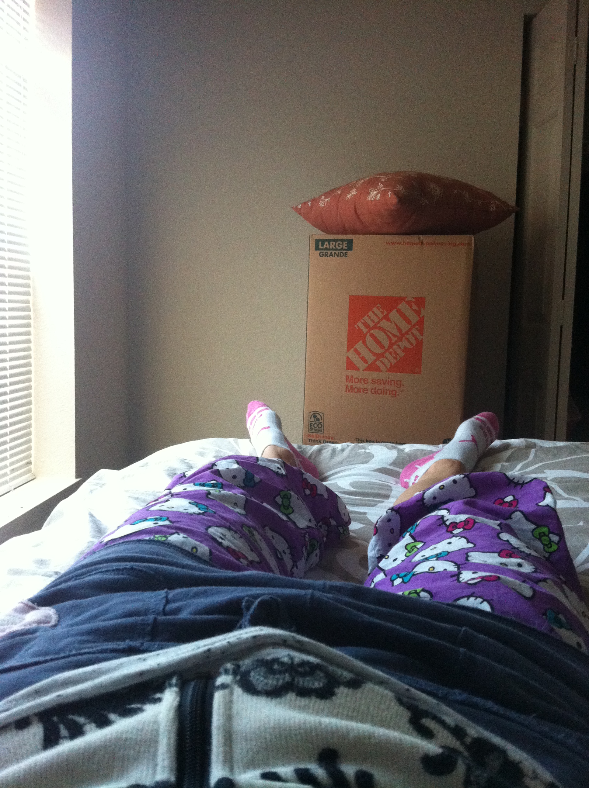 Whatevs. We shoved the 5 boxes or so on top of the rubble (and I do mean rubble, the place was recently renovated) and headed out for much-needed drinks and food. Substantially woozy an well-fed, we blew up the air mattress we brought along for the evening. Our movers weren’t coming until the morning so we had to “rough it” the first night. And rough it, we did.