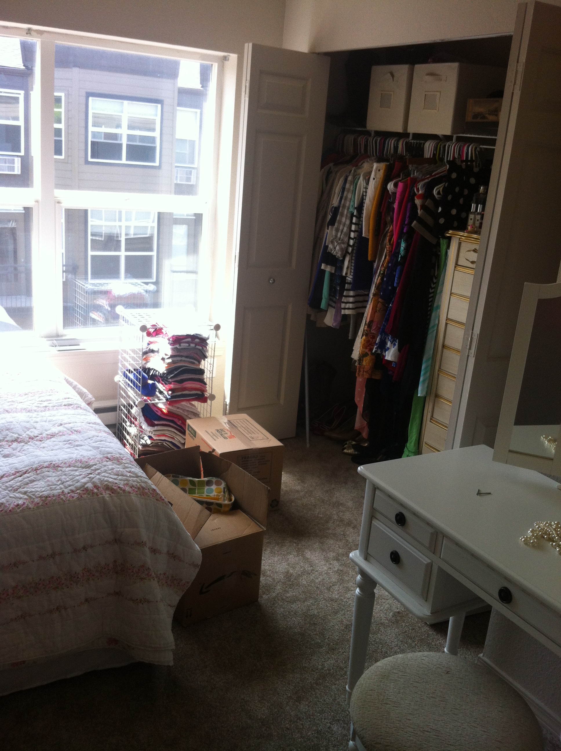 Since our new place isn’t as, *ahem* spacious as our 2,600 square-foot house we moved from (imagine), I had to economize a bit. Which means that things like winter clothes, that fancy stock pot, or my 10,000 cookbooks are and will remain in a box. There simply isn’t the closet space for all of our clothes, winter coats, ski pants and all my tap shoes (kidding).Luckily, we have a spare office space off the garage we can use to store any extraneous items.