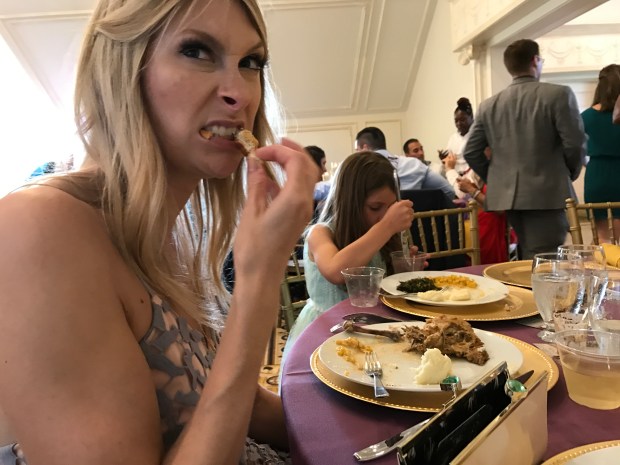 The ceremony was lovely and the reception was beautiful as well. We had chicken, mashed potatoes, collard greens and corn with a delicious sauce. And rolls. I obviously like m’rolls.