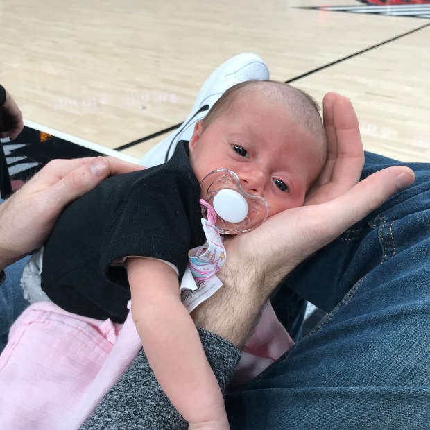 We sat court side and the baby did just fine. David is so good with her, it makes things so easy.