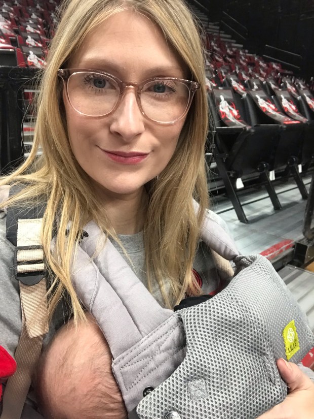 This baby wearing business is awesome. I adore it. I mean, what is better than having your baby right up against you all snuggly warm?! NOTHING. I even shot a free throw while wearing her.