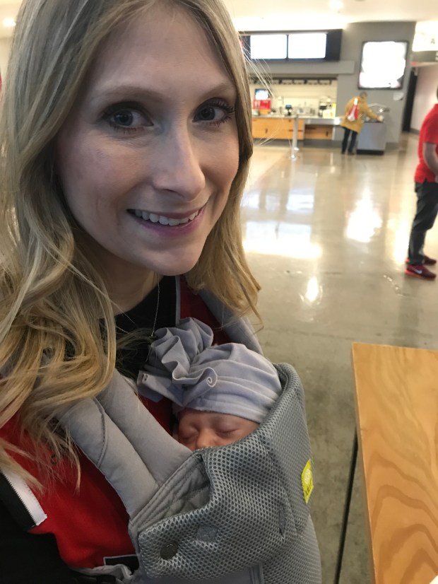 We did decide to duck out a few minutes early and I hurriedly put on the baby carrier, diaper bag and coat to make a swift getaway. David turned around as we were exiting the arena and just started laughing at me…