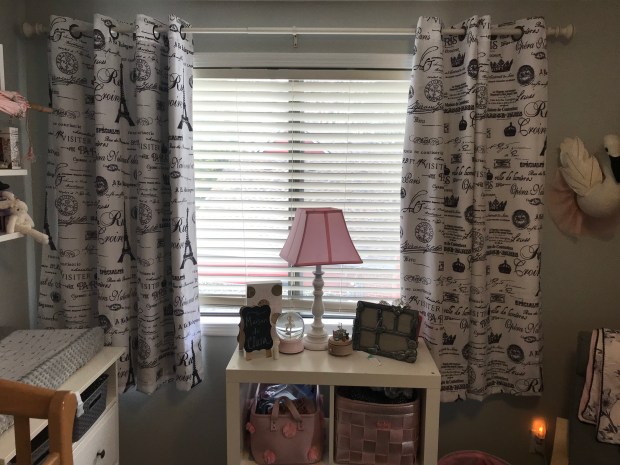 UPDATE: My mom sewed blackout curtains on the back of these Parisian panels David’s mom got us that we have had for awhile. The work perfectly in this room!