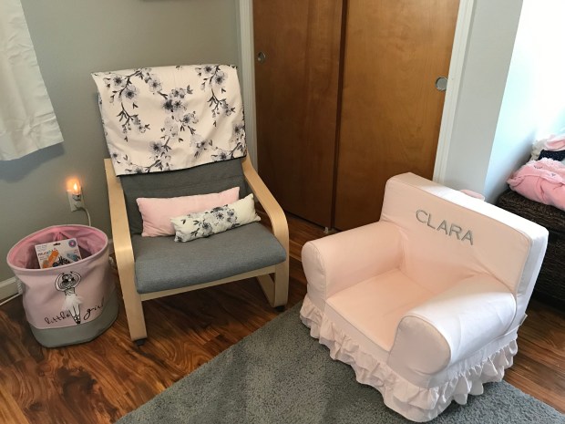 This is a bouncy chair from Ikea and it is super comfy. The little Clara chair is actually from Pottery Barn Kids and was a gift from my amazing work.