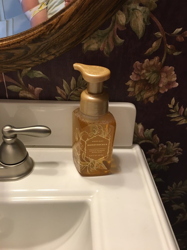Yes I consider putting a brand spanking new BBW hand soap in the bathroom an improvement. And no, we have not removed this wallpaper yet. It’s kindof growing on me 😉