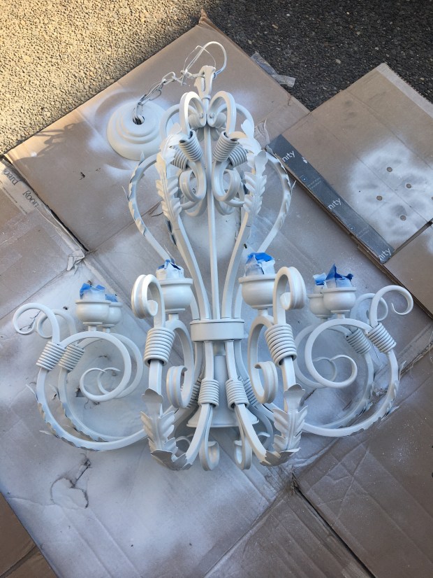 I took down this giant monstrosity from the dining room and decided to spray paint it white in an attempt to save us from buying a brand new one. I think I like it!