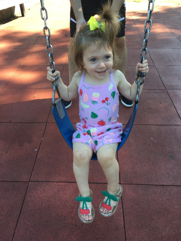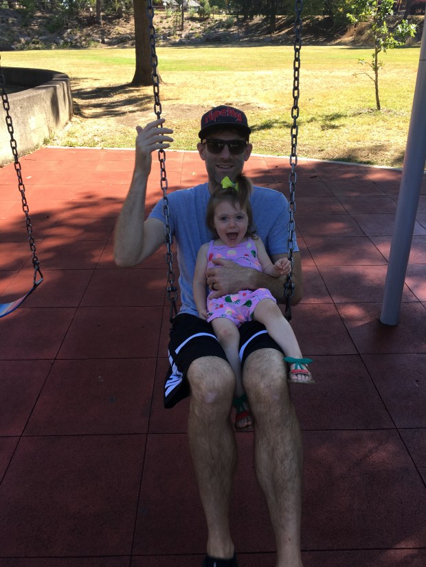 Since parks these days are abysmal ghost towns that remind us the golden days of yesteryear, we have mostly steered clear. We did stop at one a couple of weeks ago and couldn’t resist an illegal session on the swing set.