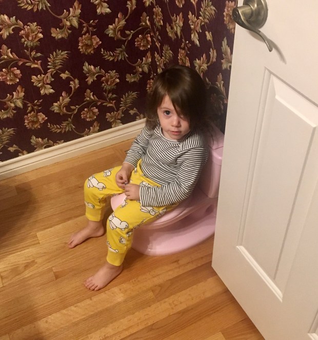 We got this little pink toilet for Clara when she was maybe 18 months old. It also “flushes”, i.e. makes the flushing noise and she loves it.