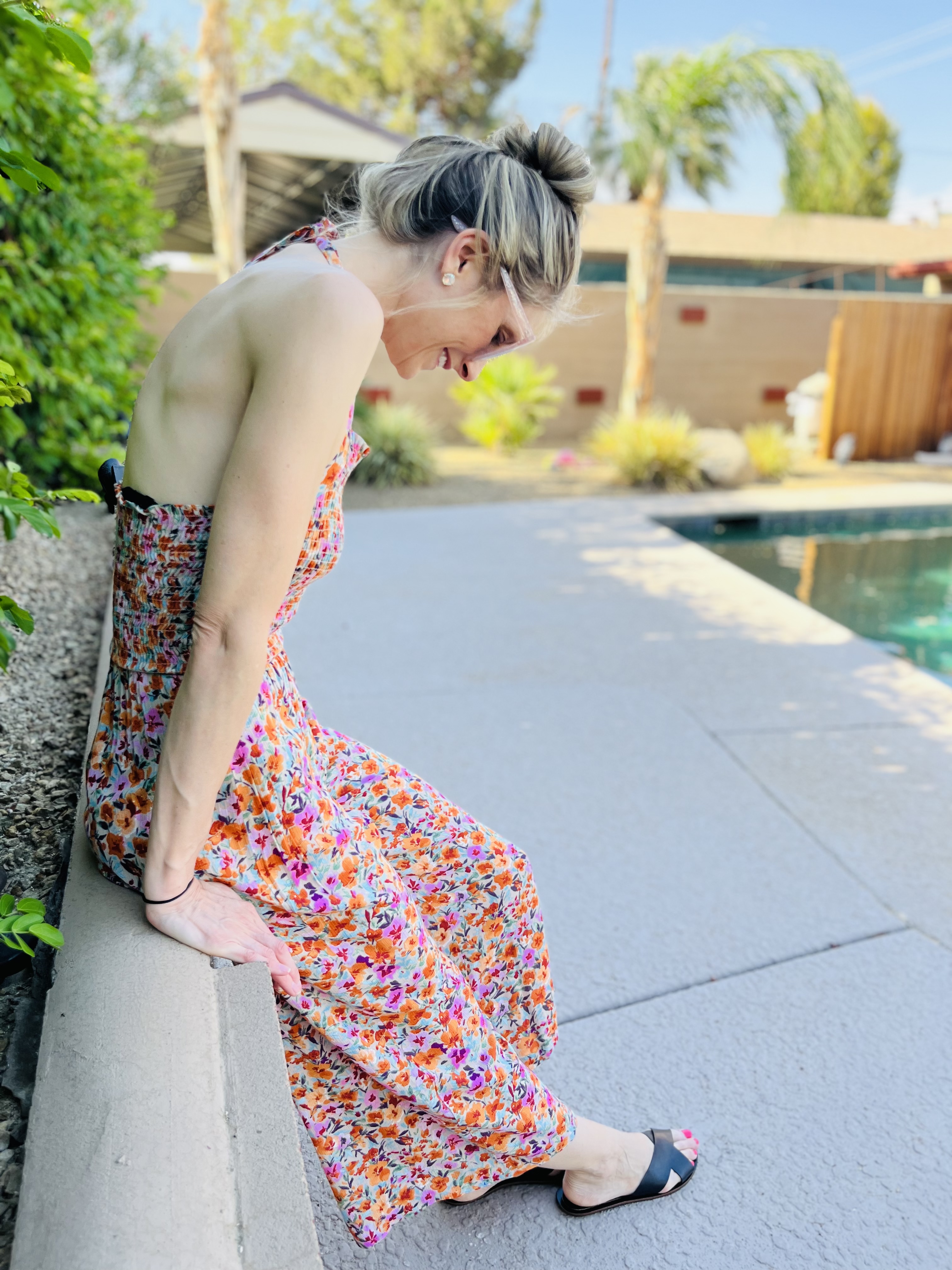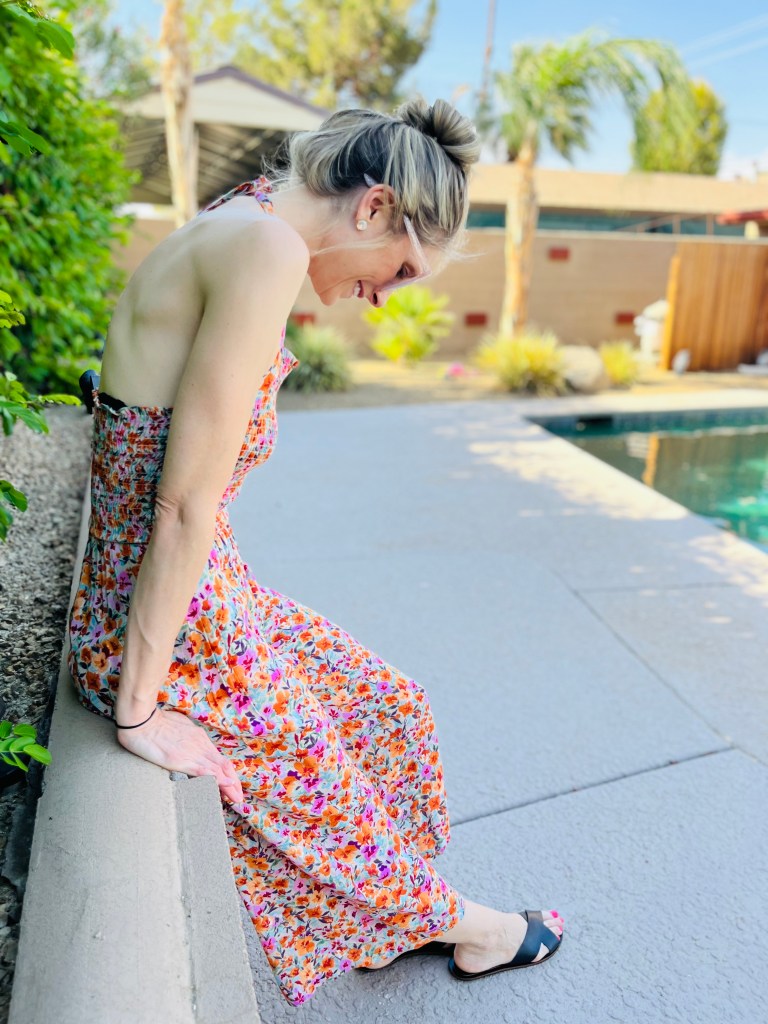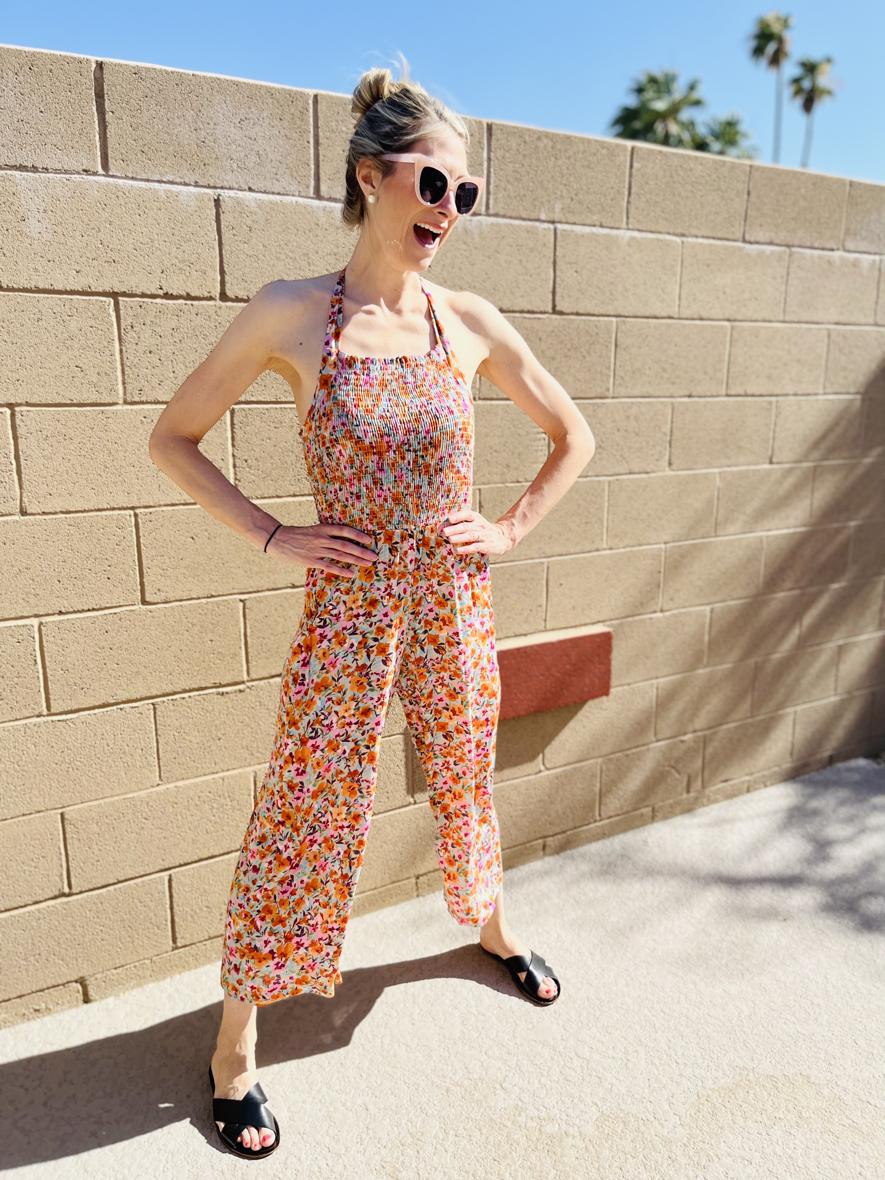 You guys, I think I have found the world’s most perfect jumpsuit for tall girls. This one from Veronica M, has a smocked waist and bust, making it perfect for a longer torso AND it has a halter tie neck so it is totally adjustable. I have never found a romper or jumpsuit that fits me this well! The bright floral print is so fun and also fiercely feminine. I have been wearing this non-stop, and love that I can pair it with basic sandals for a casual look, or heels to dress it up.