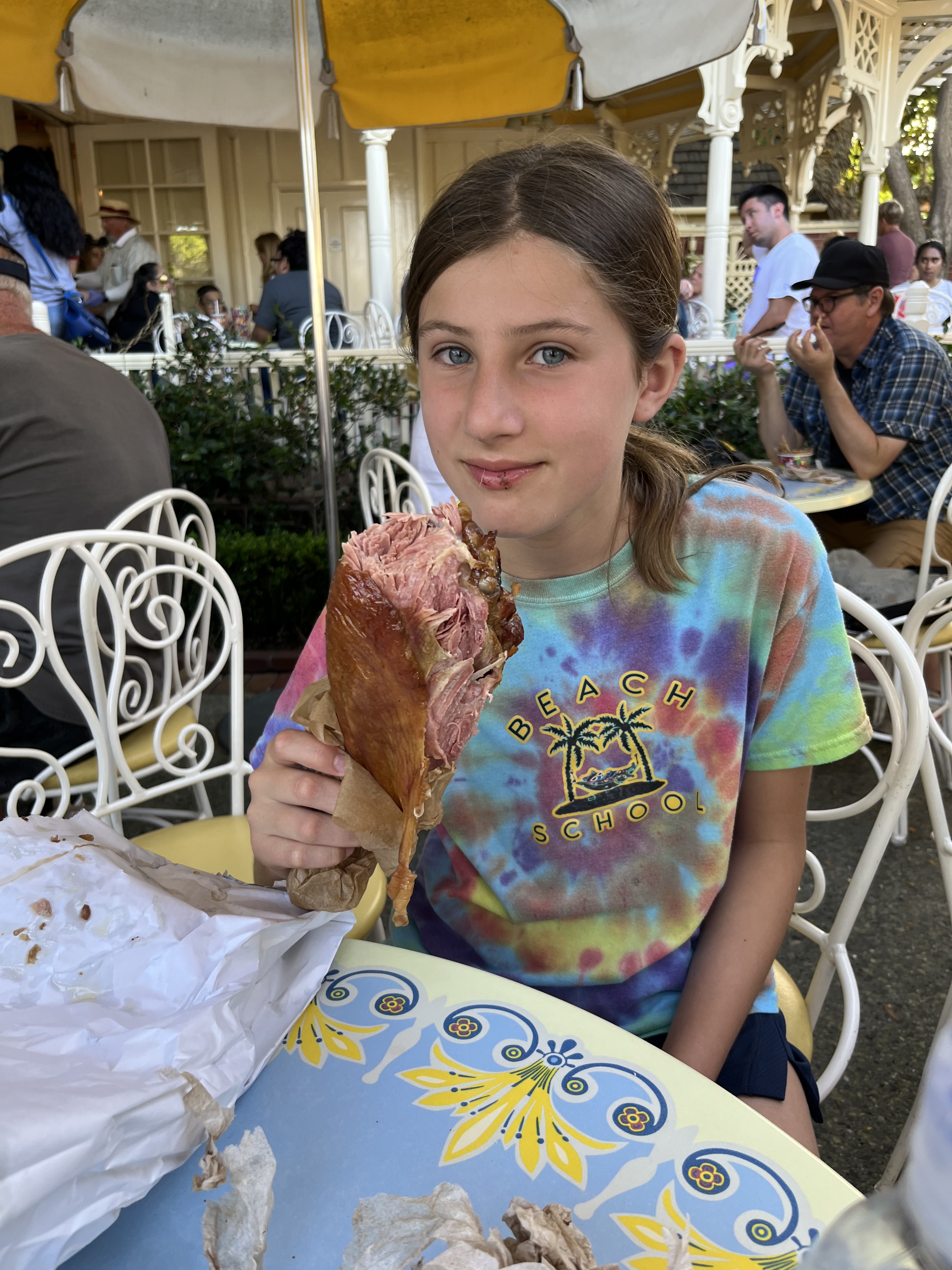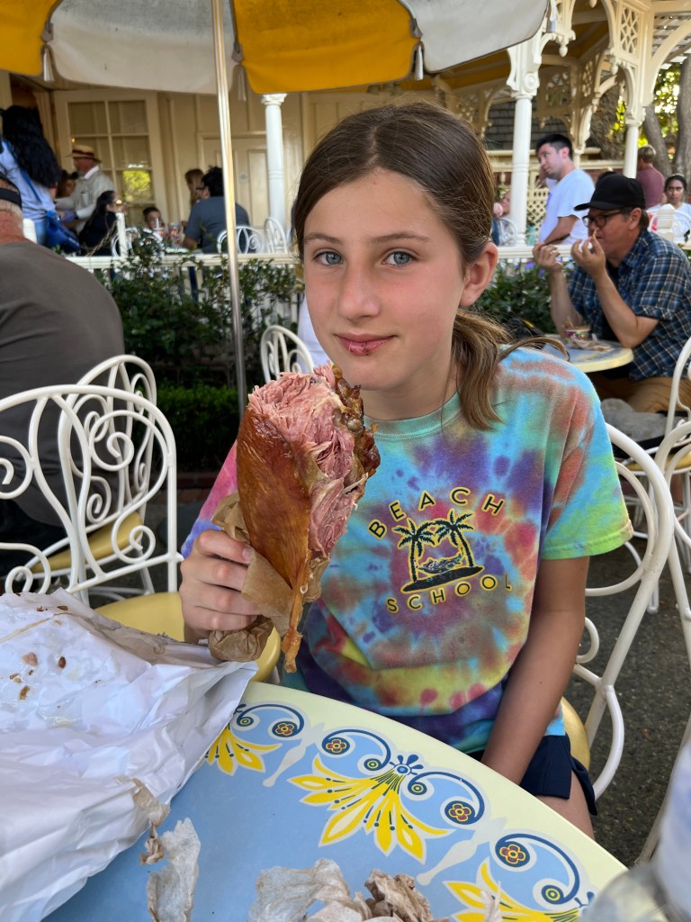 I was having the best time, as so much has changed since I was a kid. We also OF COURSE visited the Tiki Room, a Disneyland classic. And we got so many classic Disneyland treats, like the infamous turkey leg which E decided to tackle all on her own!