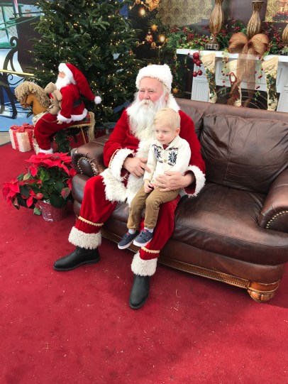 OF COURSE right before it is Tate’s turn to meet Santa this DUMB-ASS employee dressed up like the Grinch, complete with the long, green, furry fingers comes over to us. So obviously Tate is absolutely terrified of him and the Grinch is like, still trying to interact with him so I just shout “Go away Grinch!”. Hahahaaa.
