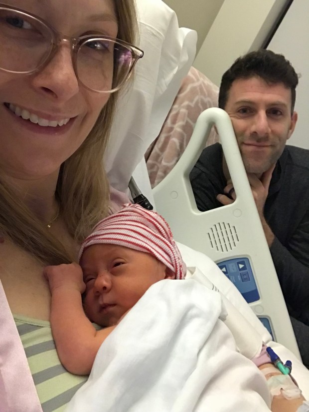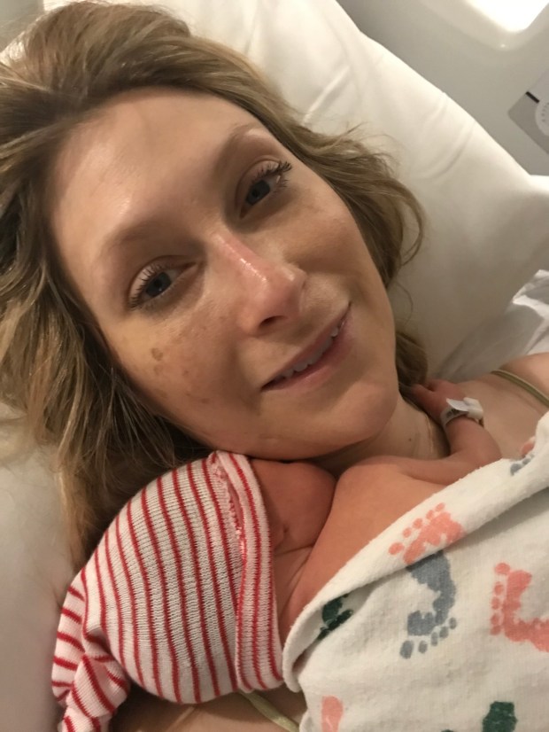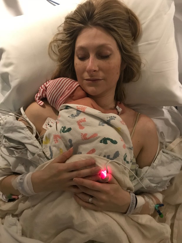 At this point, I was taken to the ICU where I spent a couple of days being very closely monitored. I had wires, tubes and monitors attached to basically every appendage including my feet. When I finally came to, a nurse from L&D introduced me to the ICU nurse who was taking care of me. They sort of explained what had happened and that the most important thing for me to do was rest, which was why I was in the ICU. David came in with the baby at one point and the L&D nurses kept coming down to check on me as well, but I was very lonely. I wanted to see my daughter and husband. The next day I finally got to leave the ICU and head back up to the 5th floor to the maternity ward to be with David and Clara. Seeing their faces again was total bliss.