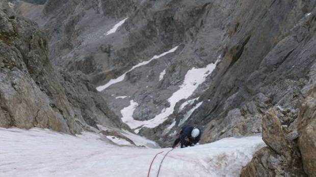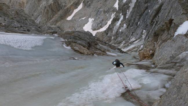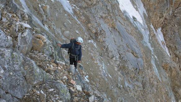 When we approached the Wall Street Ledge we noticed from the undisturbed snow that no one had climbed the Upper Exum anytime recently, perhaps not since last season. With the sun now warming our faces we began the climb.