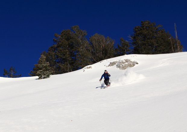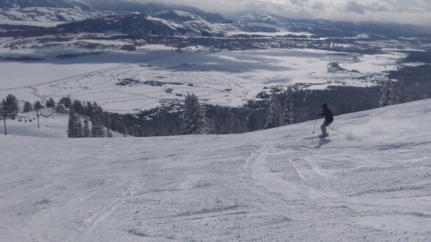 When we arrived at the Village we were greeted by no line for the Teewinot lift. Perfect for some warm-up laps.