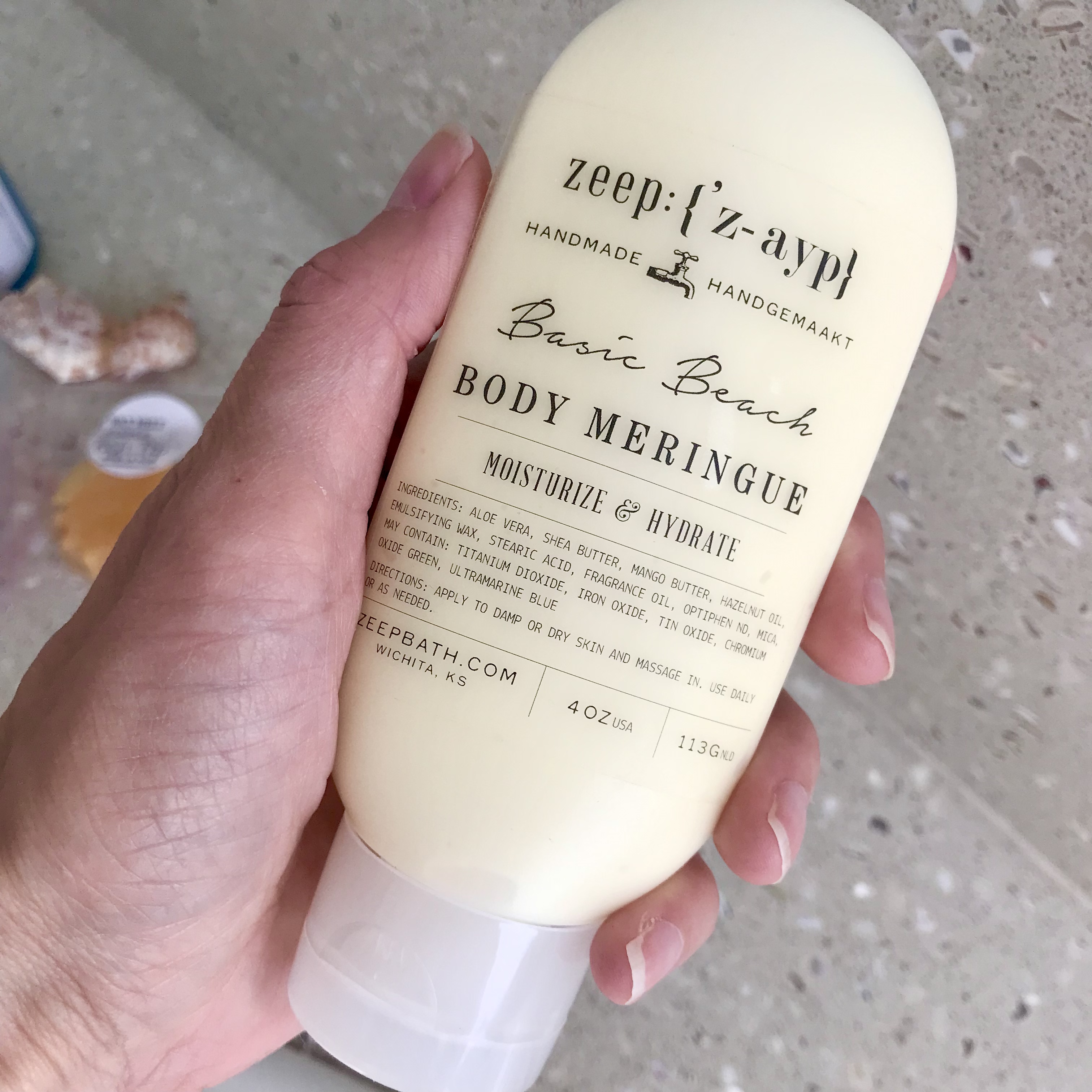 I decided I had to try one of their famous body meringues (I mean, meringue?!). I decided to try the Basic Beach scent, which is described as “fresh coconut, creamy vanilla, toasted marshmallow and refreshing sea salt”. Can you tell I love coconut?? This body cream is incredibly thick and contains both mango and shea butter as well as hazelnut oil and aloe vera. While it is a very rich consistency, I do not find it overly greasy or difficult to rub in.
